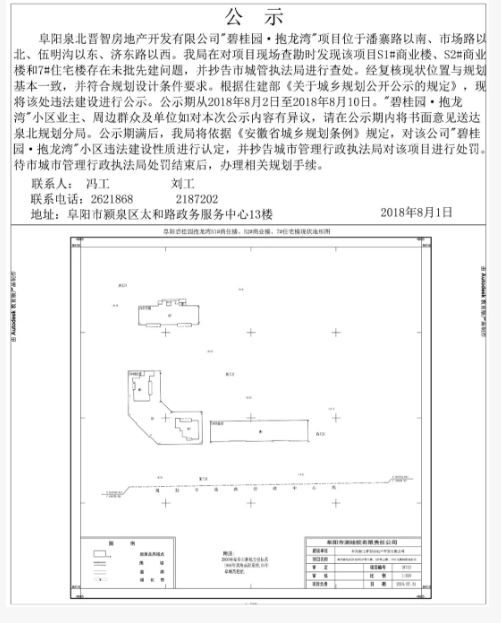 阜阳泉北晋智房地产开发有限公司碧桂园·抱龙湾项目位于潘寨路南侧,市场路北侧,济东路西侧。我局在对项目现场查勘时发现该项目S1#商业楼、S2#商业楼和7#住宅楼存在未批先建问题,并抄告市城管执法局进行查处。经复核现状位置与规划基本一致,并符合规划设计条件要求。根据住建部《关于城乡规划公开公示的规定》,现将该处违法建设进行公示。公示期从2018年8月2日至2018年8月10日。碧桂园·抱龙湾小区业主、周边群众及单位如对本次公示内容有异议,请在公示期内将书面意见送达我局。公示期满后,我局将依据《安徽省城乡规划条例》规定,对该公司碧桂园·抱龙湾小区违法建设性质进行认定,并抄告城市管理行政执法局对该项目进行处罚。待市城市管理行政执法局处罚结束后,办理相关规划手续。